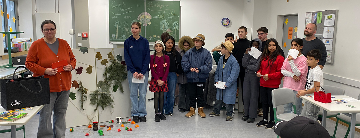 „Mit Rotkäppchen auf dem Weg“ ist der Titel des Theaterprojekts, bei dem die VKL sich wie das kleine Mädchen mit der roten Mütze auf den Weg gemacht hat. Begleitet wurde die Klasse von dem Schauspieler und Theaterpädagogen Lukas Kientzler, der die Schülerinnen und Schüler in die Welt des Theaters eingeführt hat. Dazu gab es verschiedene Übungen wie zum Beispiel sich wie ein Tier bewegen, pantomimisch einen Beruf zeigen (und die Klasse muss ihn erraten), ein Gefühl wie Freude, Angst oder Stolz darstellen, eine Alltagsszene mit einem Konflikt vorspielen, ein Standbild zu einer Rotkäppchen-Szene bauen und vieles mehr.