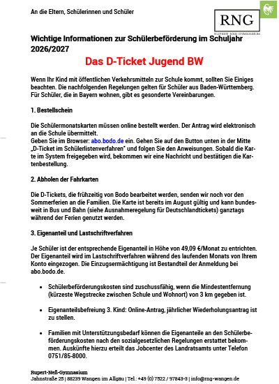 Für alle Schüler*innen, die mit dem Schulbus zu uns ans RNG kommen, veröffentlichen wir hier die Informationen, die uns als Schule zur Verfügung gestellt werden. Sollten sie dazu Nachfragen haben, dann wenden sie sich bitte an die jeweils zuständige Fahrkartenstelle.