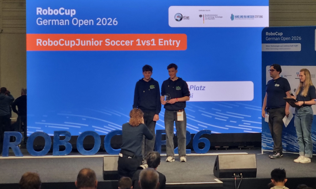 Für gleich zwei große Höhepunkte sorgten Podiumsplätze am Finaltag: In der Soccer-Disziplin 1‑gegen‑1 Entry erspielten sich Simon Brandstetter und Luka Steib nach sechs packenden Partien den dritten Platz – in einem Feld der 18 stärksten Teams Deutschlands. In der Einsteigerliga im Soccer kommt jeweils ein autonom agierender Roboter pro Team mit zwei Antriebsmotoren und stark reglementierter Hardware zum Einsatz. Umso beeindruckender ist es, wie souverän die beiden unzählige Probleme an ihrem Roboter lösten und sich so gegen die Konkurrenz durchsetzten: Präzise Ballortung, cleveres Stellungsspiel und ein zuverlässig agierender Antrieb machten den Unterschied. Mit dem dritten Platz hat sich das Team für die Europameisterschaft in Wien qualifiziert.